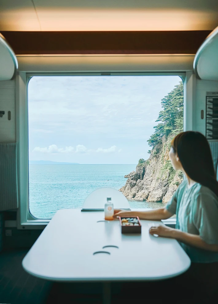 「のってたのしい列車」シリーズの一つで、日本海を舞台に新潟駅から山形県・酒田駅まで走る観光列車「海里」。日本海の荒波がつくりだした奇岩を眺望できる「笹川流れ」や、この地域ならではの海・山の恵みを車内で味わうことができます。