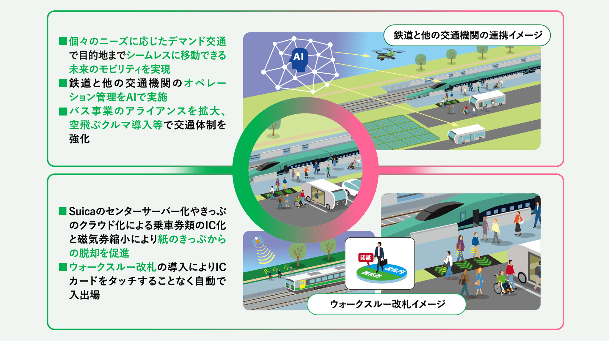 私たちはお客さまや地域の皆さまの生活に寄り添ってビジネスを展開している企業グループです。世の中の変化と「ヒト起点の発想」を踏まえ、シームレスに移動できる未来のモビリティを実現していくことが重要です。例えば、個々のニーズに応じたデマンド交通、鉄道と他の交通機関との連携、紙のきっぷからの脱却、ICカードをタッチすることなく自動で入出場できるウォークスルー改札により新たな価値を生み出します。