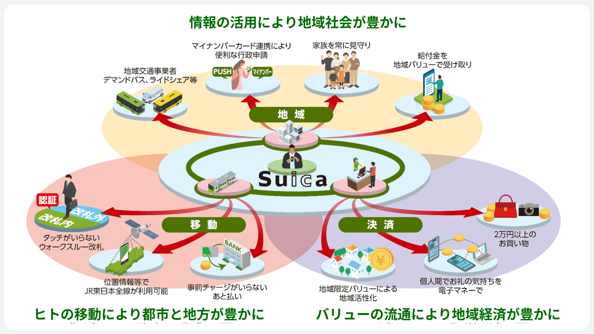 1日約1,600万人のお客さまが移動し交流する「駅空間」という最大のリアルな経営資源を活かして、JRE POINTを基軸にお客さまや沿線の皆さまのくらしとつながる「Beyond Stations構想」を推進。全ての人の心豊かな生活の実現のために、Suicaで集まるデータを元に、従来の便利/シームレスを上回るライフ・バリューを創造すること、新たなマーケット創造することを通じて新たなJR東日本グループのビジネス圏を拡大します。